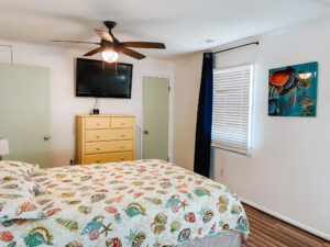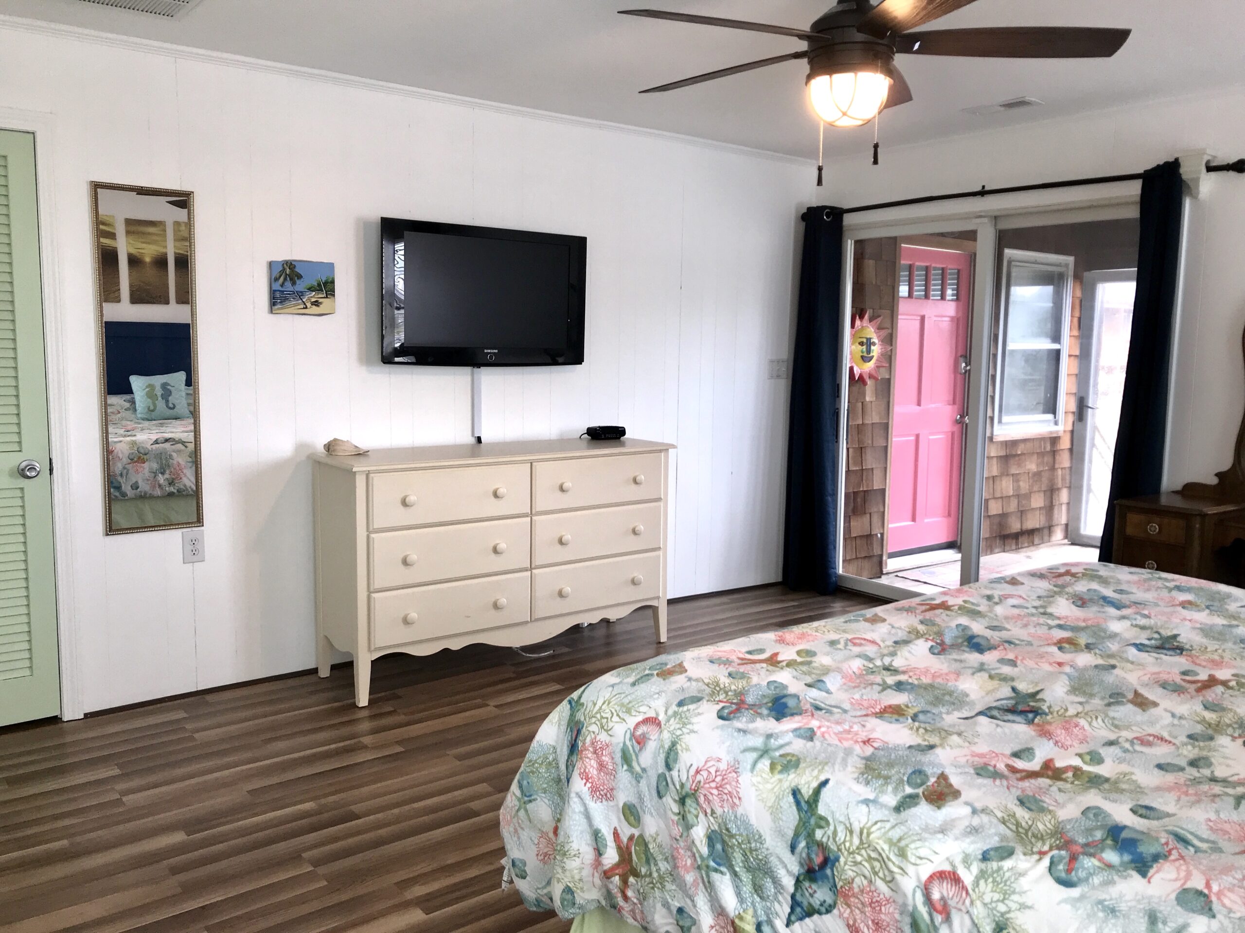 Bedroom 1: King Bed, large dresser, TV, in-suite bathroom
