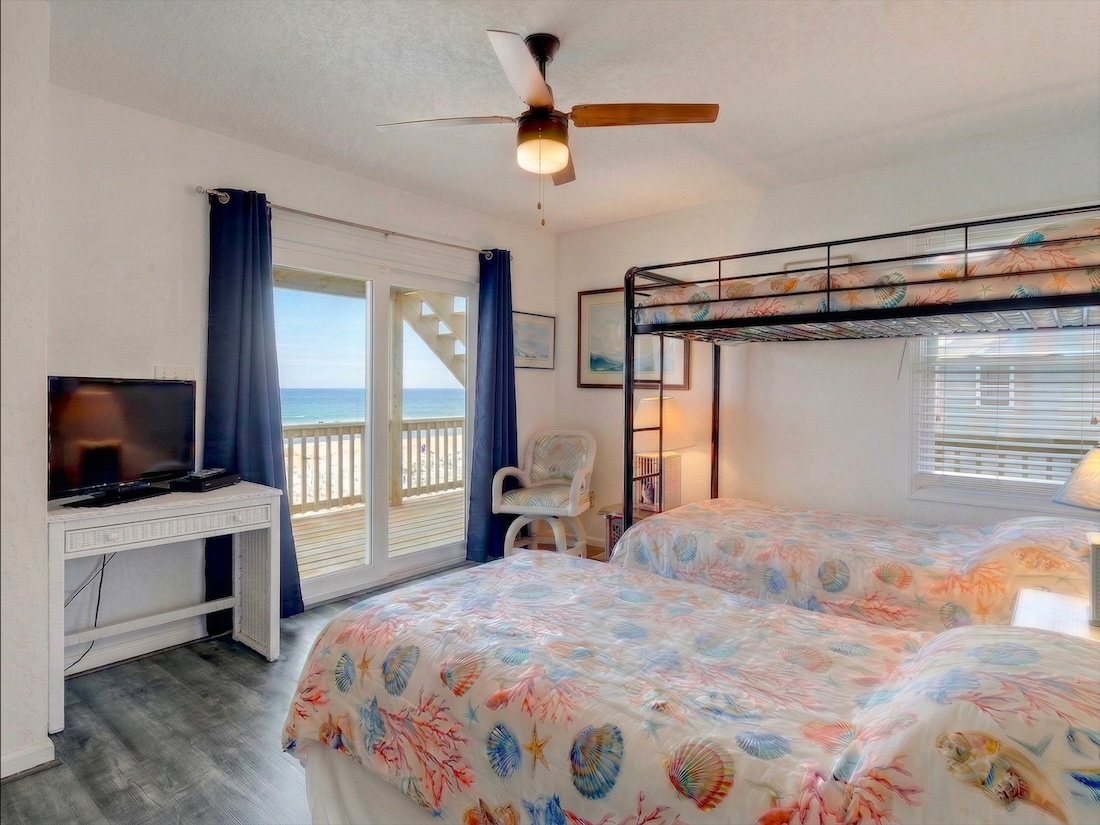 Bedroom 4: Enclosed outdoor Pyramid Bunk (double bottom/twin top), Twin Bed, dresser, closet, sliding glass doors to deck